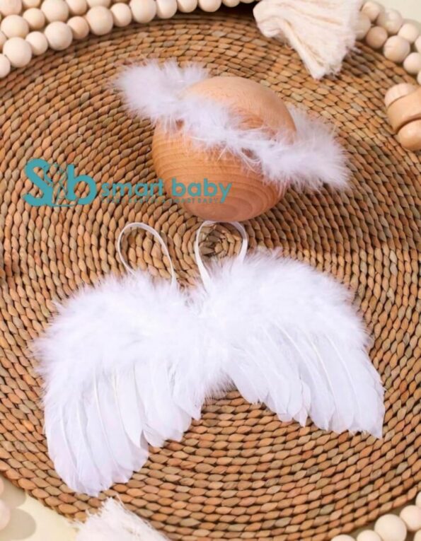 The set includes lightweight feather wings with elastic straps for a comfortable fit and a matching fluffy halo headband. Perfect for newborn photo shoots, birth announcements, or special memories.